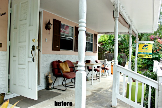 7 – Update the windows. I have really high hopes for this change. Once we remove the faux brick we open up the possibility of installing full sized windows. These stubby little ones do nothing but make the space feel even more stout than it is. This porch was built with no spare head room (see how it’s pretty flush with the top of the front door) so having the vertical vision broken up even more with stubby windows and the faux brick only serves to make it feel … well … stubby. We are tossing around the idea of raising the roof (only for the porch) … but that is a much more major project that we’ll tackle if the plan to unify the house color and update the windows doesn’t enhance the look of the space enough.